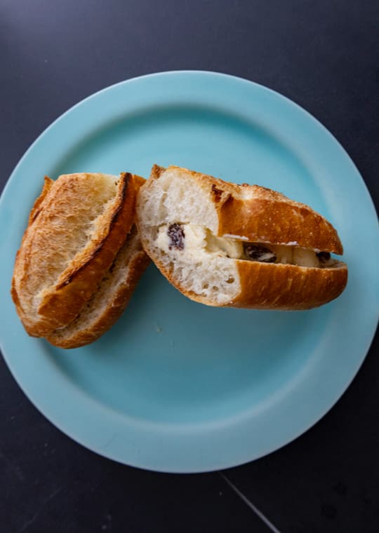 ぱりっと香ばしくもっちりとしたハードブレッドに、コンデンスミルク入りの自家製バタークリームとジューシーなラムレーズンをサンド。やさしい甘さの中にふわっと広がるラムの香りが楽しめます。